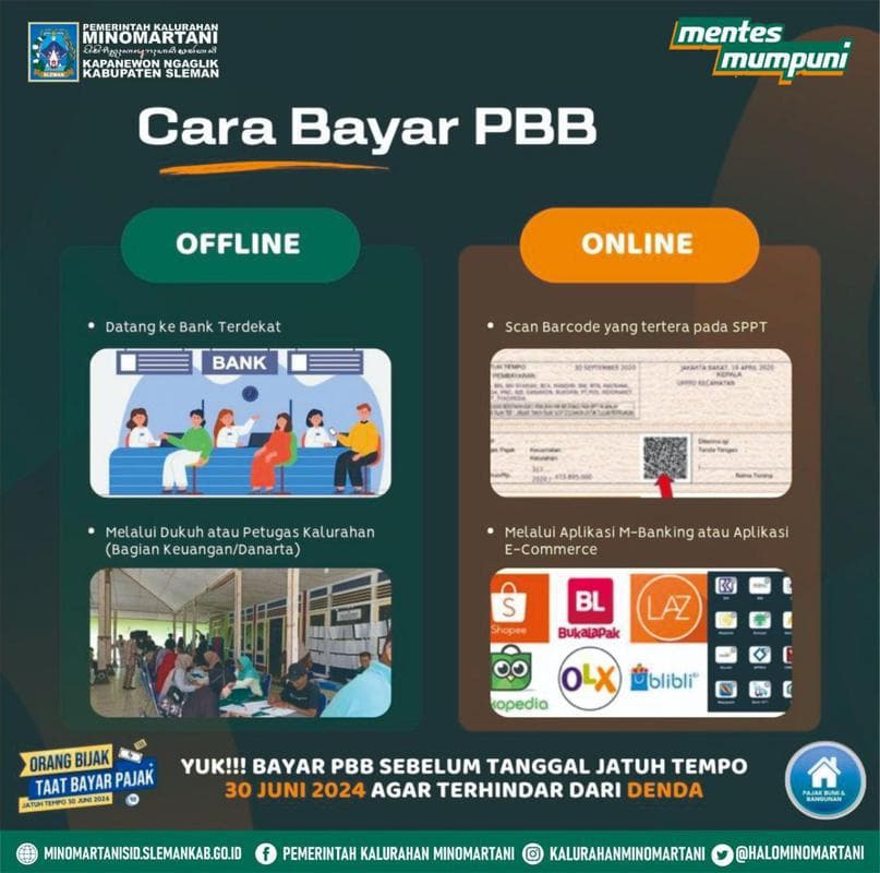 Untuk memudahkan warga dalam membayar PBB P2, Pemerintah Kalurahan Minomartani telah menyediakan beberapa alternatif pembayaran, yaitu: